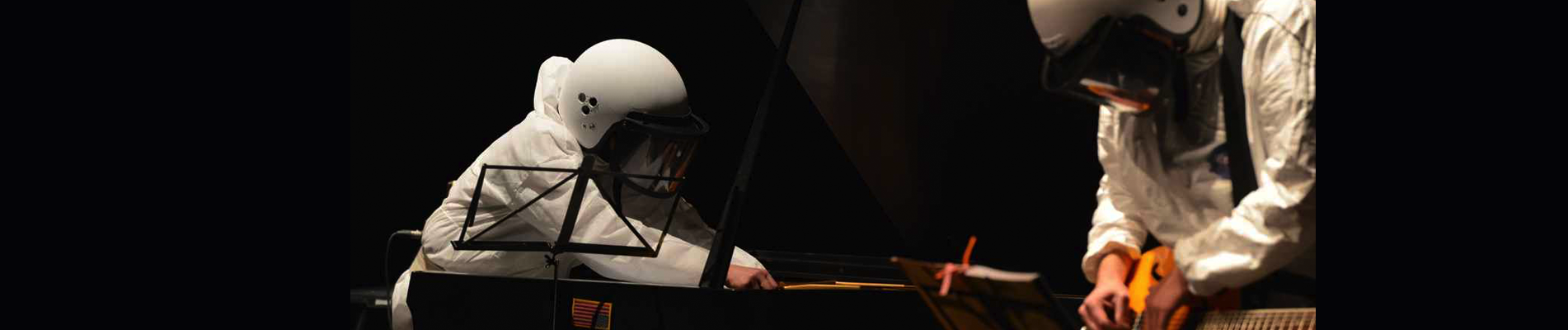 Une performance qui multiplie les dispositifs sonores et visuels dans laquelle les musiciens deviennent Aldrin et Armstrong, deux des astronautes membres de l’équipage d’Appolo 11 en 1969. Cet univers auto-dérisoire interroge la pertinence de tout ce déploiement de moyens mis en place pour conquérir l’espace ou… se conquérir soi-même